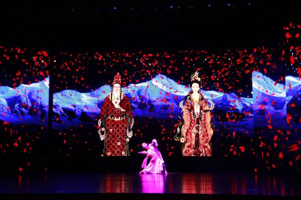 《古道传奇》是一部融合现代“穿越”梦幻风格的情景舞台秀,该剧由西宁艺术剧院着力打造,从去年5月起已在全国各个城市巡演数十场,得到观众的热烈反响。《古道传奇》以“情景秀”为主要表现形式,以文成公主入藏开启古道传奇为主线索、“穿越”古今对话为辅助线,生动再现唐蕃古道的历史文化传说和人文风貌,追述汉藏人民千百年来的友好历史和深情厚谊。演出还以历史浪漫主义为主基调,真实性与艺术性相融合,尊重基本历史事实与大胆改编民间传说相结合,突出瑰丽雄奇的色彩。此外,现场采用高科技手段打造立体舞台,同时汇集了舞蹈、歌唱、杂技、魔术等多种艺术形式,配合视频、大幕投影等高科技手法,使演出既具有现代动感,又富有地方韵味。演出一开始,气势恢宏的开场音乐便将观众深深吸引,“长安宫柳送依依,凤披霓裳路西行”,大唐皇宫巍峨耸立,文武百官与侍卫款款前出,文成公主身披霓裳西出长安,踏上和亲之路,开启千年古道传奇。演员们精神饱满、忘我投入,把一条见证汉藏友好的“千年平安路”、联通西南邻邦的“商贸黄金路”、代代相传永续美好的“ 爱情之路”演绎得淋漓尽致。