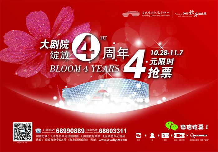 盐城市文化艺术中心大剧院成立于2011年,值此四周年庆典之际,为感谢广大市民对我剧院的支持与关注,特为全市人民准备了一场精彩、华丽的艺术盛宴,让绚丽多彩的艺术生活温暖您的冬季之旅。