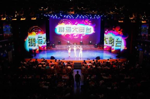 演艺大舞台是超豪华、超震撼演艺大厅,分上下演艺大舞台:面积达5500平方米,总投资:3000万元。该演艺舞台配备一流的灯光音响和LED大屏,观众区分上下两层,可同时容纳480人娱乐消费一流的环境,一流的音响,一流的灯光,一流的装潢,更有一流的演艺氛围让您流连忘返。演艺大舞台自2011年5月18日试运营至今,天天有演出,上座率达90%以上,营业收入达1000万元,利税近百万元。两层,可同时容纳480人娱乐消费。