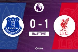 上半场补时2分钟,埃弗顿0-1利物浦。