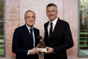 体育资讯4月7日讯 皇马将在本轮欧冠八强战首回合主场迎战拜仁,皇马官方也晒出了两家俱乐部主席的合照。