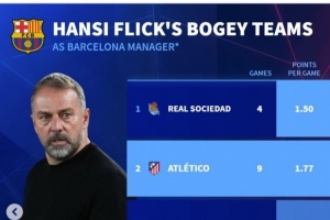 体育资讯4月9日讯 欧冠1/4决赛首回合比赛,巴萨主场0-2不敌马竞,据德国转会市场统计,弗里克执教巴萨以来对阵马竞场均拿到1.77分,仅多于对阵皇家社会的1.5分。