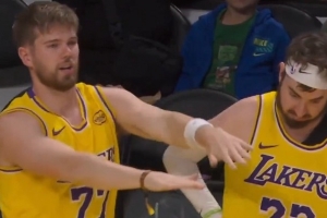 比赛中镜头给到场边,两名球迷形似东契奇和蒂米,山寨版东契奇翩翩起舞,非常忘我。