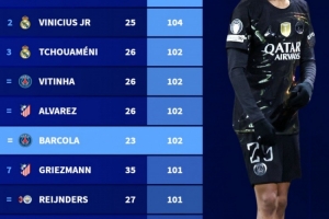 体育资讯4月14日讯 德国转会市场统计了上赛季以来五大联赛球员出场次数情况,巴尔韦德以109场居首,维尼修斯104场、琼阿梅尼102场分列二三位,前三均为皇马球员。