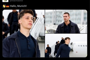 皇马球员们已经抵达慕尼黑,准备参加这场重要比赛,官方社媒晒出球员们的照片,德语配文:“你好,慕尼黑!”